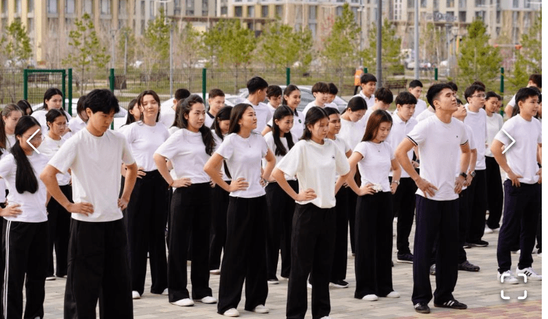 Бірыңғай флешмоб барысында оқушылар тазалық пен салауатты өмір салтын дәріптейтін түрлі спорттық би қойылымдарын қойып, ұжымдық әрекеттер ұйымдастырды.