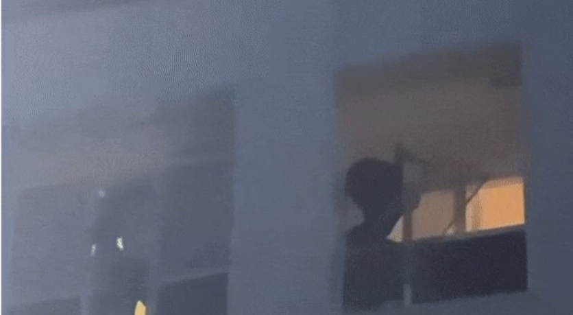 На кадрах видно, как парень перелазит из окна одной квартиры в окно соседней. Он снимает москитную сетку и влезает в окно. За происходящим с волнением наблюдает толпа очевидцев.